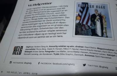 Under vignetten «Verdensbildet» i VG Helg 10. mars skrev vi at en seremoni med AR-15-rifler i Pennsylvania ble organisert av en gruppe fra Unification Church, « […] som i Norge kaller seg Enhetskirken». Den norske Enhetskirken tar sterkt avstand fra denne koblingen og er tydelig på at våpenseremonien ble organisert av en gruppe uten tilknytning til dem. Enhetskirken sier den tar klar avstand fra enhver religiøs seremoni som inkluderer våpen og en teologi som har våpenbruk som en sentral del av sin lære. (Fra side 4)