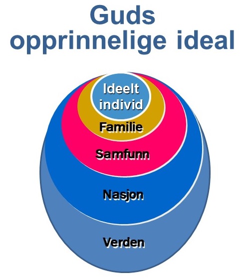 Den fredfylte verden som vi arbeider for å skape, er en verden basert på modne individer som skaper gode familier, samfunn og nasjoner. Det var en slik verden Gud opprinnelig planla da han skapte. Den første Guds sønn og den første Guds datter klarte imidlertid ikke å nå personlig modenhet og greide derfor heller ikke å skape en harmonisk familie. Hele menneskeheten nedstammer fra den første mann og den første kvinne (Adam og Eva). Fordi de aldri ble i stand til å realisere Guds skapelsesideal, og fordi de aldri oppnådde den nødvendige modenhet til å bli menneskehetens Sanne foreldre, fikk deres etterkommere, dvs. hele menneskeheten, ikke det nødvendige eksempel på fullkomne individer, ideelle familier, samfunn og nasjoner.