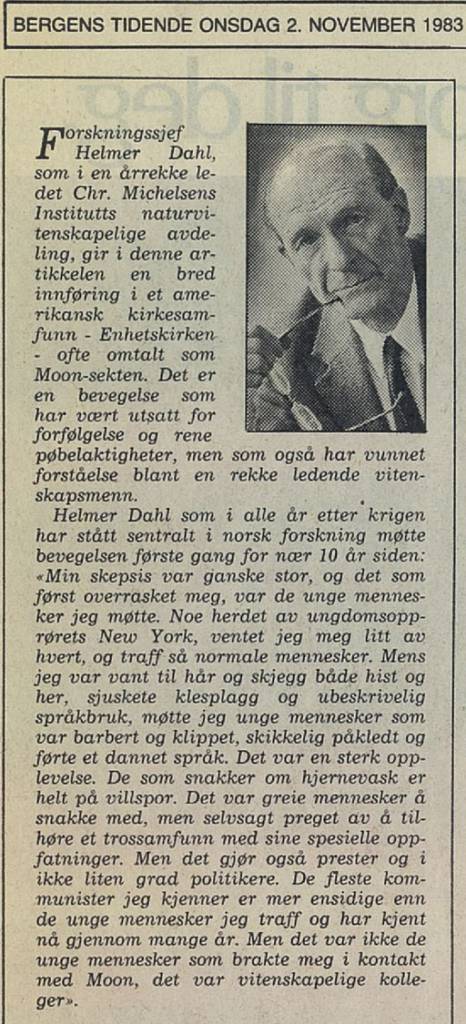 Helmer Dahl, som i alle år etter krigen har stått sentralt i norsk forskning, møtte bevegelsen første gang for nær 10 år siden: «Min skepsis var ganske stor, og det som først overrasket meg, var de unge mennesker jeg møtte. Noe herdet av ungdomsopprørets New York, ventet jeg meg litt av hvert, og traff så normale mennesker. Mens jeg var vant til hår og skjegg både hist og her, sjuskete klesplagg og ubeskrivelig språkbruk; møtte jeg unge mennesker som var barbert og klippet, skikkelig påkledt og førte et dannet sprak. Det var en sterk opplevelse. De som snakker om hjernevask er helt på villspor. Det var greie mennesker å snakke med, men selvsagt preget av å tilhøre et trossamfunn med sine spesielle oppfatninger. Men det gjør også prester og i ikke liten grad politikere. De fleste kommunister jeg kjenner er mer ensidige enn de unge mennesker jeg traff og har kjent nå gjennom mange år. Men det var ikke de unge mennesker som brakte meg i kontakt med Moon, det var vitenskapelige kolleger».