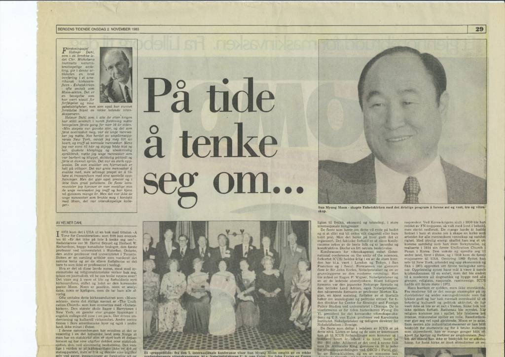 Forskningssjef Helmer Dahl, som i en årrekke ledet Chr. Michelsens Institutts naturvitenskapelige avdeling, gir i denne artikkelen en bred innføring i et amerikansk kirkesamfunn – Enhetskirken – ofte omtalt som Moon-sekten. Det er en bevegelse som har vært utsatt for forfølgelse og rene pøbelaktigheter, men som også har vunnet forståelse blant en rekke ledende vitenskapsmenn.